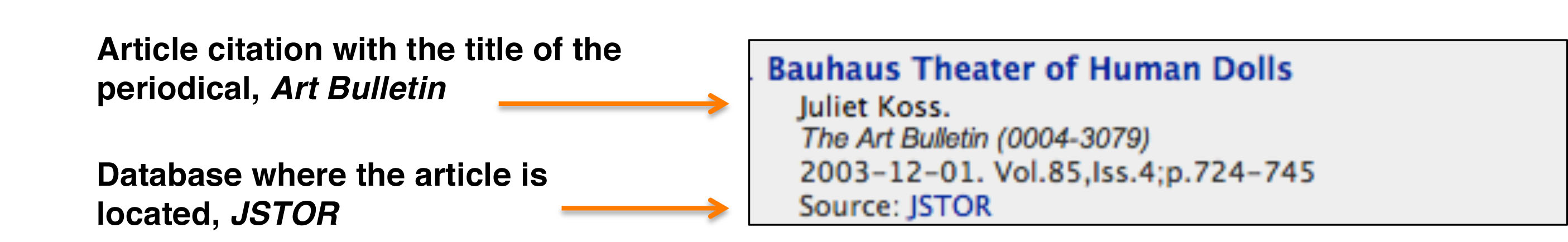 If the database does not contain the full-text of the article, the citation includes all the pieces of information you will need to find the article. Citations of articles often include the author, title, magazine or journal name, page numbers and publication information. You can then use this information to determine if you have access to the article through the CCA Libraries collection of periodicals in print.
